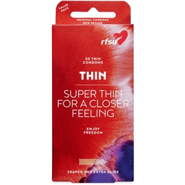 RFSU Thin är tunna kondomer för en närmare känsla, nästan som utan. Thin är för alla som tycker att en extra tunn kondom är en bättre kondom. Ofärgad, profilerad latexkondom med slät yta, behållare och glidmedel. Bredd 53 mm