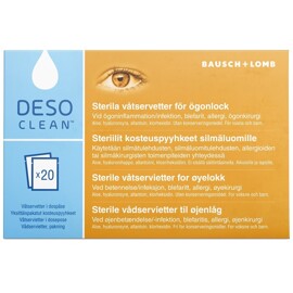 Desoclean Sterila ögonservetter Aloe, hyaluron, allantoin, klorhexidin Behandling av ögonlock och ögonfransar vid kladdiga, inflammerade eller infekterade ögon, blefarit, allergi, samt före/efter ögonoperation. Lämplig även för linsanvändare. Vuxna och barn. Utan konserveringsmedel.