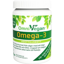 Omega-3 olja av bästa kvalitet utvunnet från alger och med ett högt innehåll av både EPA och DHA. Perfekt vegetabiliskt alternativ till fiskolja. Med endast en kapsel om dagen kan veganer, vegetarianer och alla andra nu täcka dagsbehovet av Omega-3 på ett effektivt sätt från en vegetabilisk källa.En kapsel innehåller 250 mg DHA och 125 mg EPA, vilket i kombination med de övriga Omega-3 fettsyrorna som produkten innehåller ger ett samlat Omega-3 intag av 426 mg.Alger är en god och direkt källa till Omega -3 till skillnad mot andra vegetabiliska alternativ som t ex linfrö och valnötter mm. Dessa innehåller alfa -linolensyra, ofta förkortat ALA. ALA är ett förstadium till Omega-3 och kan bilda EPA och DHA under rätt förhållande. Många faktorer kan dock verka hämmande på denna omvand-lingsprocess, såsom stort intag av Omega-6 fettsyror, ensidig kost samt en mindre effektiv matsmältning.Grunden till att fisk och skaldjur innehåller Omega-3 fett-syror är att de lever av alger i haven eller av smådjur, som har alger som sin föda. Alla alger är dock inte lika rika på Omega-3 fettsyror. I VegOmega-3 används en mikroalg som heter Schizo-chytrium sp. Denna mikroalg, som är en naturlig havsalg, fermenteras utan bruk av kemiska preparat, under skon-samma förhållande i produktionsanläggningar på land. Denna noggrant kontrollerade framställningsmetod ger en algolja av högsta kvalitet och renhet.