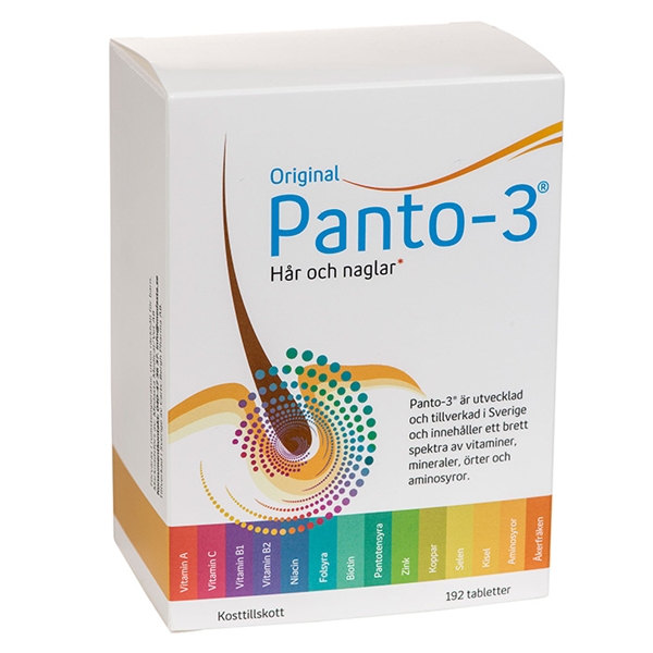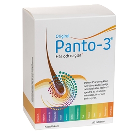 Ett välkomponerat näringstillskott som innehåller en mängd olika ämnen som booster till hår, naglar och hud. Panto-3 är särskilt rik på B-vitaminer och dessutom fri från jäst. Panto-3 innehåller hela 27 olika ämnen, såsom mineraler, vitaminer örter och aminosyror. Panto-3 innehåller niacin som har en kärlvidgande effekt och ökar genomströmningen av blodet till hårets rötter så att den viktiga näringen når fram. Endast två tabletter per dag.