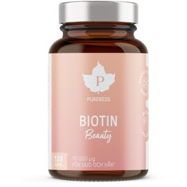 Pureness Biotin är en unik sammansättning av biotin och kollagenpeptider.Biotin, även känt som vitamin B7, är ett viktigt näringsämne som bidrar till att bibehålla normalt hår, hud och naglar. Det stödjer även kroppens energiomsättning genom att hjälpa till att omvandla fett, protein och kolhydrater till energi. Eftersom biotin är vattenlösligt behöver det tillföras regelbundet via kosten eller som kosttillskott.1 kapsel innehåller hela 10 000 μg Biotin. Precis som alla Pureness kapselprodukter, har den hög absorptionsförmåga och saknar naturligtvis fyllnadsmedel!
