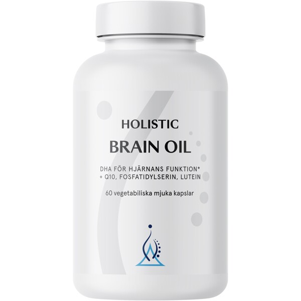 Främjar långsiktig hjärnhälsa – bibehåller mental skärpa genom livet Stödjer minne, fokus och mental energi Bidrar till bibehållen synförmåga och ögonens vitalitet Holistic Brain Oil är ett kosttillskott för dig som vill ge hjärnan optimala förutsättningar – både idag och för framtiden. Produkten är särskilt utvecklad för att främja minne, fokus, kognitiv funktion och synförmåga, och innehåller noggrant utvalda ingredienser som samverkar för att stödja hjärnans struktur och funktion. Brain Oil kombinerar DHA (docosahexaensyra) från mikroalgen Schizochytrium sp. – en långkedjig omega-3-fettsyra som utgör en viktig del av cellmembranen i hjärnan och ögonen – med koenzym Q10, fosfatidylserin och lutein. DHA bidrar till att bibehålla normal hjärnfunktion och normal synförmåga*. Koenzym Q10 finns naturligt i mitokondrierna och deltar i kroppens energiproduktion, medan fosfatidylserin är en del av hjärnans cellmembran och har betydelse för nervcellernas kommunikation. Lutein är ett näringsämne som finns naturligt i ögats gula fläck och i hjärnvävnad, där det spelar en roll för syn- och hjärnfunktion. Med sitt fokus på rena råvaror och hög kvalitet är Holistic Brain Oil ett genomtänkt tillskott för dig som vill ta hand om din mentala vitalitet och bibehålla skärpan genom hela livet. * Gäller vid ett dagligt intag av 250 mg DHA. Produkten är 100% veganvänlig och innehåller inga onödiga tillsatser. Holistics burkar är gjorda av 96 procent biobaserad plast.
