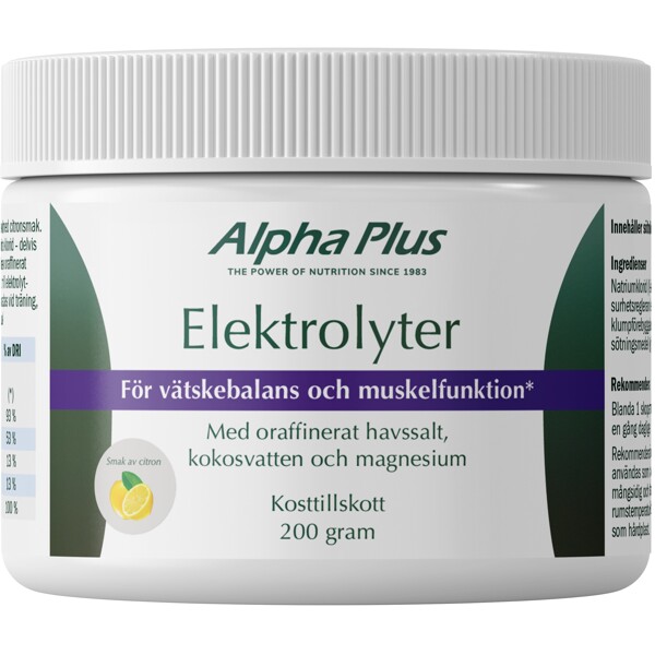 Alpha Plus Elektrolyter är en elektrolytblandning i pulverform med fräsch citronsmak. Den innehåller fem viktiga elektrolyter: magnesium, kalium, kalcium, natrium och klorid. En del av mineralerna kommer från naturliga källor såsom kokosvattenpulver (CocoMineral®) och oraffinerat havssalt från Guérande. Produkten är även förstärkt med vitamin C. Magnesium bidrar till elektrolytbalansen och till normal muskelfunktion. Alpha Plus Elektrolyter passar utmärkt vid fysisk aktivitet, fasta eller andra tillfällen då kroppens behov av elektrolyter ökar.