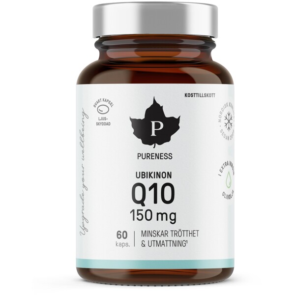 Ubikinon Q10 i extra virgin olivolja, i en ljusskyddad kapsel. En Pureness Ubikinon Q10 mjuk gelatinkapsel innehåller 150 mg fermenterat ubikinon och 15 mg vitamin C. Vitamin C bidrar till normal energiomsättning samt till att minska trötthet och utmattning.Q10 är mycket känsligt för ljus, därav har kapselns skal färgats svart med hjälp av vegetabiliskt kol. Q10 är helt upplöst i högkvalitativ extra virgin olivolja inuti kapseln.