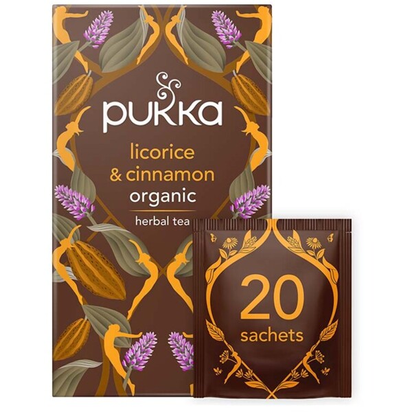 Pukka Licorice & Cinnamon är ett rikt och fylligt örtte. Lakritsrot har valts ut för en söt och fyllig smak och kanel ger en mild kryddad finish. Cikoriarot, som är naturens bästa ersättare till kaffe, piggar upp kroppen och sinnet.