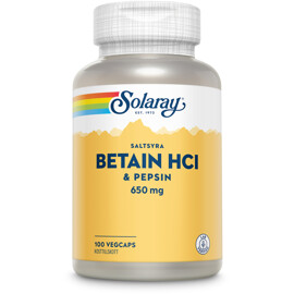 SOLARAY BETAIN HCI & PEPSIN innehåller enzymet pepsin och betainhydroklorid (saltsyra). Används vid behov i samband med måltid.Betain bidrar till normal homocysteinomsättning. Homocystein är en aminosyra som bildas från metionin och påverkas av näring och genetik. Höga nivåer i blodet är associerade med ökad risk för hälsoproblem. Betain hjälper till att minska homocysteinnivåerna genom att fungera som metyldonator och stödja metyleringsprocessen.