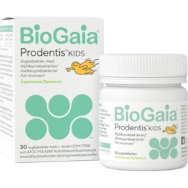 BioGaia Prodentis KIDS är ett avancerat probiotiskt kosttillskott för munnen* med fräsch äpplesmak. Innehåller två patenterade bakteriestammar av hög kvalitet som hjälper till att balansera den orala bakteriefloran.