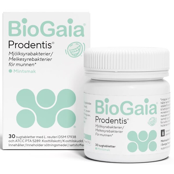BioGaia Prodentis är ett avancerat probiotiskt kosttillskott för munnen* med fräsch mintsmak. Innehåller två patenterade bakteriestammar av hög kvalitet som hjälper till att balansera den orala bakteriefloran.