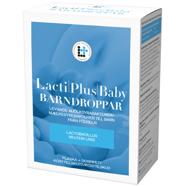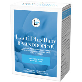 Lactiplus Baby Barndroppar är ett kosttillskott med mjölksyrabakterier från fem utvalda stammar. 2 miljarder mjölksyrabakterier per dagsdos.Flaska 30 ml med dospipett. Flaskan innehåller 30 doser á 1 ml.Häll påsens innehåll i flaskan med olja. Stäng och skaka flaskan tills dess att pulvret lösts upp. Sätt på doseringspipetten och kläm på den mjuka delen för att pumpa in oljan i röret. Skaka flaskan kraftigt före varje användning. Bottensats kan bildas vilket är helt normalt och försvinner när flaskan skakas . Fyll pipetten med 1 ml om dagen och inta skedvis eller utspädd i kall eller ljummen dryck före måltid under 30 dagar. Dropparna kan tas i flera omgångar. Blandningen håller sig 1 månad i rumstemperatur. Varje dospåse innehåller 60 miljarder levande mjölksyrabakterier motsvarande 30 dagars förbrukning när innehållet blandas i flaskan.Detta är ett kosttillskott. Rekommenderad daglig dos bör inte överskridas. Kosttillskott bör inte inte användas som ett alternativ till en varierad kost. Förvaras utom räckhåll för små barn.