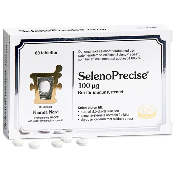SelenoPrecise är små, runda vita tabletter med 100 mikrogram selen i form av Pharma Nords patenterade selenjäst. Innehåller biotillgängligt organiskt selenometionin och fler än 20 andra organiskt bundna selenföreningar. Preparatet är unikt eftersom dess innehåll av olika organiska selenföreningar liknar den naturliga variation av selen som vi får i oss från selenrik mat. Selen bidrar till normal funktion av immunsystemet och sköldkörteln samt till att bibehålla normalt hår och naglar. Lämplig för veganer och vegetarianer.