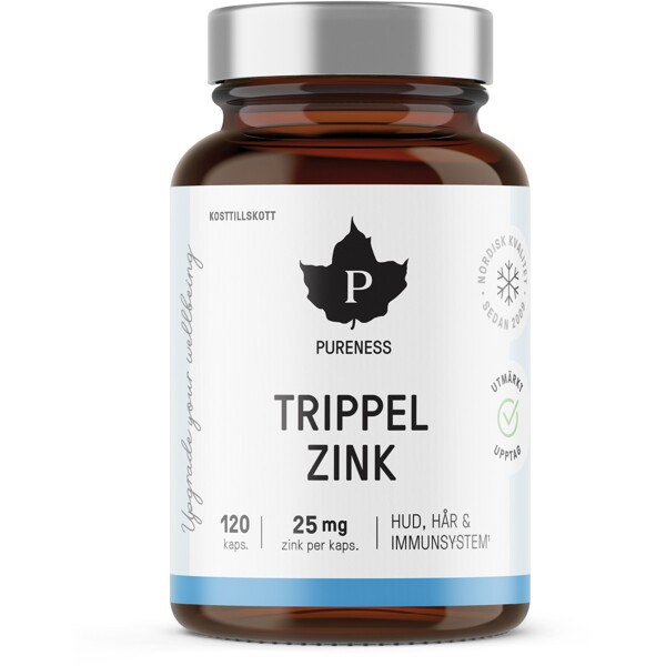 Zink är viktigt för skelettet, håret och hudens välmående.Vi på Pureness har arbetat ordentligt med produktutvecklingen för att få fram ett alldeles unikt zinktillskott som kroppen kan ta upp. Det första vi gjorde var att välja ut tre former av zink med den bästa absorptionsförmågan (zinkpikolinat, -bisglycinat och -monometionin). Sedan kombinerade vi dem med fria aminosyror för att vidare främja upptagningen av preparatet i kroppen. Slutligen tillsatte vi C-vitamin eftersom vitaminet främjar upptagningen, samt stödjer zinkens positiva inverkan på immunförsvaret.Pureness Trippel Zink innehåller även den aktiva formen av vitamin B6, nämligen P5P (pyridoxal-5-fosfat). P5P hjälper bland annat kroppen att använda zink. Dessutom stimulerar P5P produktionen av pikolinsyra som hjälper zinken att tas upp på utmärkt sätt av kroppen. Produkten innehåller 2 mg P5P per kapsel.Det var kanske väldigt mycket detaljerad information på en gång, men vi är väldigt stolta över vårt Trippel Zink!