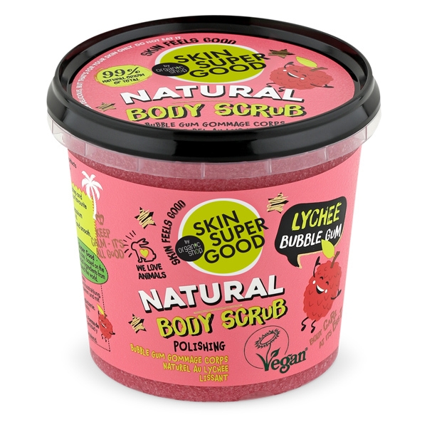 Skin Super Goods Kroppsskrubb Lychee & Bubbelgum med ekologiskt litchiextrakt, vanilj och naturligt socker som exfolierar, återfuktar och gör huden mjuk och smidig. Innehåller även ekologiskt myntaextrakt som lugnar huden.