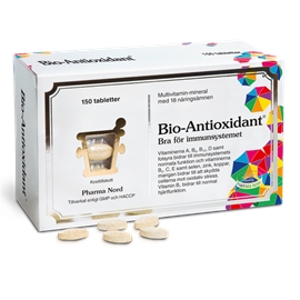 Antioxidanter - kroppens skydd mot skadliga fria radikalerDet finns absolut inget sätt att garantera ett långt liv. Vi åldras alla, även om processen varierar från person till person. Ärftliga faktorer och inflytanden från omvärlden påverkar sättet vi åldras på, men tack vare antioxidanterna lyckas vi skydda kroppen mot diverse negativa yttre inflytanden. Antioxidanter är en vanlig beteckning på en grupp vitaminer och mineraler, som skyddar oss mot de s.k. fria radikalerna. Fria radikaler är skadliga och mycket aggressiva kemiska föreningar, som attackerar cellerna i vår kropp. Om vi inte har tillräckligt med antioxidanter för att neutralisera dessa fria radikaler kan cellerna ta skada.Bio-Antioxidant® - ett effektivt cellskyddBio-Antioxidant® innehåller 19 primära och sekundära antioxidanter och ytterligare näringsämnen. Dessa har sammanställts i en formulering framtagen i nära samarbete med välrenommerade näringsforskare. Preparatet anpassas hela tiden till de senaste rönen inom antioxidantforskningen för att kunna erbjuda konsumenten ett maximalt antioxidativt skydd för kroppens celler och därmed främja hälsan. Bio- Antioxidant® är ett speciellt kombinerat antioxidantpreparat, som bl.a. innehåller de viktigaste vitaminerna (betakaroten, C-vitamin och E-vitamin) och organiskt selen i form av l-selenomethionin.Kampen mot fria radikalerFria radikaler oxiderar cellmembranen och förorsakar sjukdom. Processen är ganska enkel. Man kan t.ex. betrakta ett halvt uppskuret äpple, som lämnas på köksbordet. Efter en stund blir det brunt. Det beror på att oxidationsprocessen har attackerat de friska cellerna i äpplet genom att bryta ner deras membraner. Antioxidanter (anti=mot + oxy=syre) motverkar oxidation och förstörelse genom att skydda cellmembranen likt en osynlig sköld. Fria radikaler utvecklas som ett resultat av: