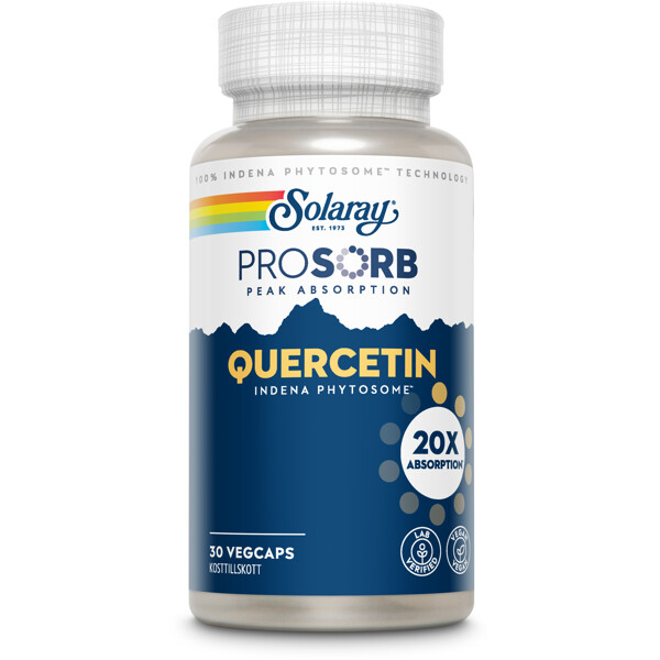 I SOLARAY PROSORB QUERCETIN används fytosomal teknik (Indena Phytosome™), vilket ger ökad absorption och biotillgänglighet. Fytosomer är ämnen som är bundna direkt till fosfolipider – en typ av fettmolekyl som finns i alla cellmembran. Denna bindning skyddar ämnet och underlättar upptag i tarmen. Produkten innehåller Quercefit™ (Quercetin Indena Phytosome™), standardiserat till 40 % quercetin. Quercetin tillhör gruppen bioflavonoider – naturligt förekommande växtämnen som bidrar till växters färg, smak och doft.
