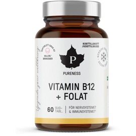 Pureness Vitamin B12 + Folat är en sugtablett med smak av hallon som innehåller aktiva former av vitamin B12. Vitaminen har ett flertal hälsofördelar, bland annat bidrar vitamin B12 till normal funktion i immunsystem och nervsystem. B12 har även betydelse för energiomsättningens funktion och ser till att minska trötthet och utmattning.Då aktiva former av vitamin B12 främst finns i animaliska livsmedel är det här tillskottet extra lämpat för de som äter vegetarisk eller vegansk kost. Det är också ett bra tillskott för äldre då kroppens förmåga att ta upp vitamin B12 i kroppen minskar med ålder.Till skillnad från många andra kosttillskott som ofta framställs i pulver- eller kapselformat görs Vitamin B12 + Folat i form av en sugtablett. På grund av den molekylära uppsättningen av B12 kan det ta längre tid för kroppen att absorbera vitaminen genom vanlig matsmältningsprocess. Det är därför inte ovanligt att B12 ges i from av en oral spray istället så att vitaminen kan tränga sig in i blodet genom de vaskulära vävnaderna i munnens slemhinnor. På liknande sätt tas Pureness Vitamin B12 + Folat upp i kroppen; snabbt och effektivt genom saliven och slemhinnorna i munnen!Förutom Vitamin B12 innehåller kosttillskottet också aktiv Quatrefolic®️ folat, en form av vitamin B9, som bidrar till normal psykologisk funktion.