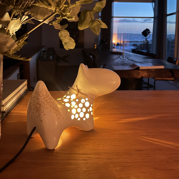 Ge ditt hem en unik charm med vår handgjorda Bull Terrier-hundlampa. Skickligt tillverkad i Thailand av återvunna papper, pryds denna förtjusande lampa av intrikata, handmålade thailändska motiv, inspirerade av traditionell Benjarongkonst, vilket tillför både belysning och karaktär till vilket rum som helst. Finns i flera färger. Storlek: Ungefär 10 x 22 x 16 cm. Material: Papier-maché av återvunnet papper, för en hållbar inredning. Handmålad med detaljerade thailändska mönster, vilket gör varje exemplar till ett unikt konstverk. Den bedårande Bull Terrier-formen introducerar ett lekfullt men ändå sofistikerat element, perfekt för vardagsrum, sovrum eller barnrum. Lätt att rengöra med en fuktig trasa.