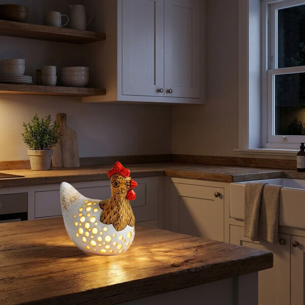 Det unika inslaget av handgjord charm och varmt ljus till vilket rum som helst med vår härliga hönslampa. Omsorgsfullt tillverkad i Thailand av återvunna papperstuber, är denna lampa dekorerad med ömtåliga, handmålade thailändska motiv, inspirerade av den vackra traditionella Benjarong-konststilen. Finns i flera färger. Storlek: Cirka 11 x 19 x 18 cm. Material: Papier-maché av återvunnet papper, främjar hållbar inredning. Handmålad med intrikata thailändska mönster, vilket ger varje lampa en distinkt konstnärlig karaktär. Den bedårande hönsformen ger en lekfull men ändå elegant touch till ditt kök, vardagsrum eller sovrum. Lätt att rengöra med en fuktig trasa