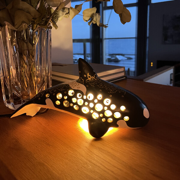 Ge ditt hem en touch av havet med vår fantastiska handgjorda Orka-lampa. Omsorgsfullt tillverkad i Thailand av återvunna papperskärnor, har denna anmärkningsvärda pjäs intrikata, handmålade thailändska motiv inspirerade av den utsökta traditionella Benjarong-konsten. Designad för att avge ett varmt, omgivande ljus, fungerar denna lampa inte bara som en vacker dekorativ mittpunkt utan tillför även en touch av hållbar elegans till din miljö.Storlek: Cirka 12 x 24 x 13,5 cm. Material: Papier-maché av återvunnet papper, främjar hållbar inredning. Handmålad med detaljerade thailändska mönster, vilket ger den en unik konstnärlig touch. Den slående orkaformen förenar kraftfull design med funktionell belysning, vilket skapar en fängslande fokuspunkt i vilket rum som helst. Lätt att rengöra med en fuktig trasa.