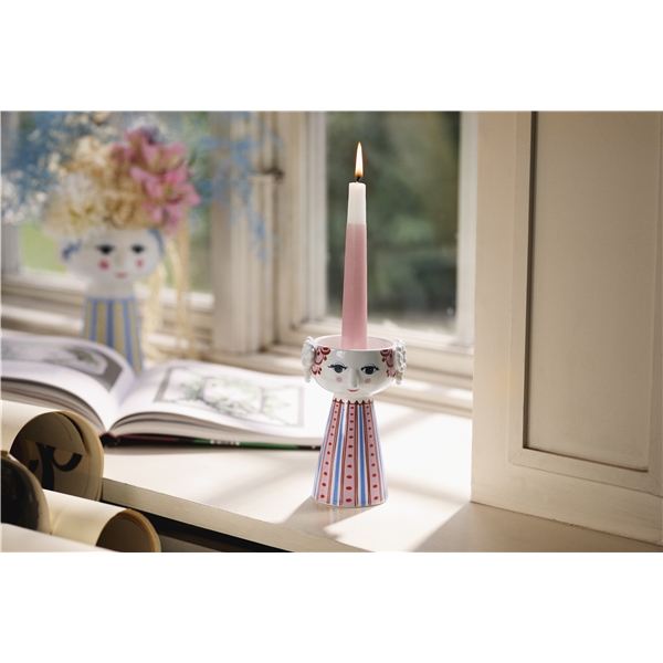 Utveckla din färgstarka personlighet och låt kreativiteten lysa med Bjørn Wiinblads Eva. Med sitt glada leende, rosiga kinder och färgglada dekorationer fångar Eva på alla sätt essensen av Bjørn Wiinblad som person och konstnär – även när hon tar formen av en ljusstake. Glad och drömmande skapar hon liv och personlighet i inredningen med sitt poetiska uttryck och sina sprudlande färger. Den här Eva-ljusstaken är 14 cm hög i dämpat rött med rosa, röda och blå nyanser. När ett tänt ljus placeras i ljusstaken lyser den upp ännu mer och gör vardagen lite mer färgstark. Ljusstaken är tillverkad av blankglaserad keramik med färgad dekal och är inspirerade av Bjørn Wiinblads ursprungliga Eva-figurer som hade breda huvuden med blomsterdekorationer och en konformad kropp. Ansiktet med de mandelformade ögonen och den spetsiga näsan är från Wiinblads ursprungliga hand och de färgglada klänningsmönstren är en nytolkning av Bjørn Wiinblads illustrationer från arkiven.