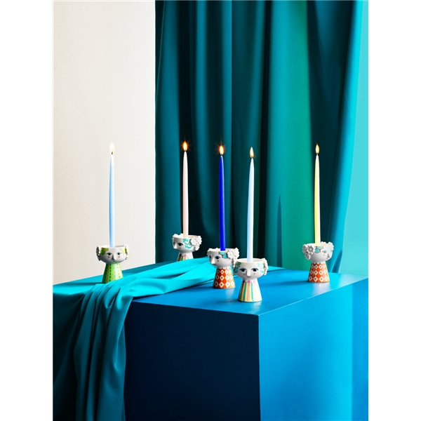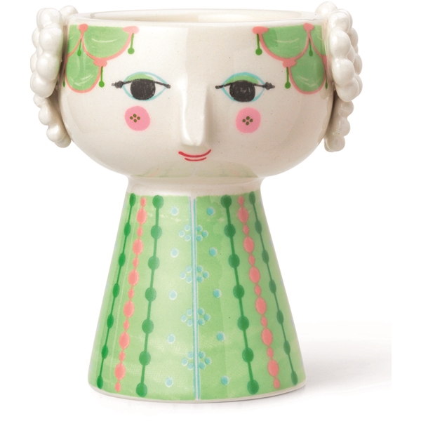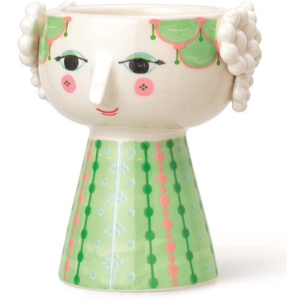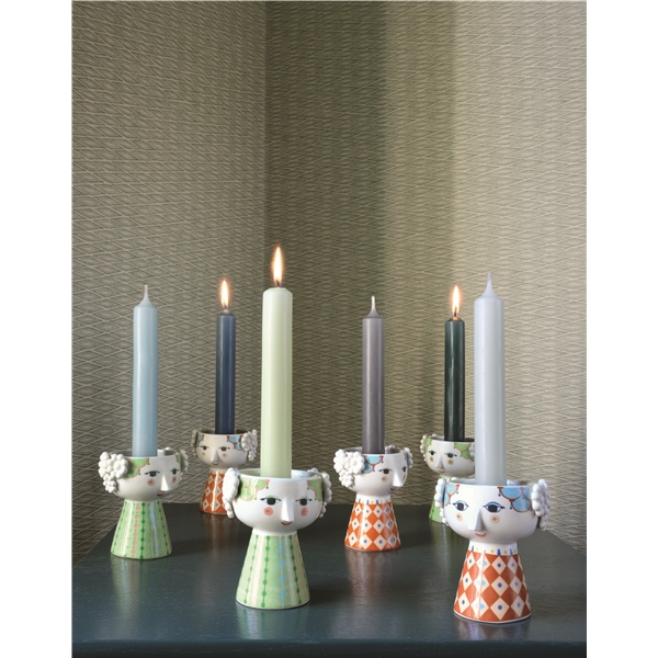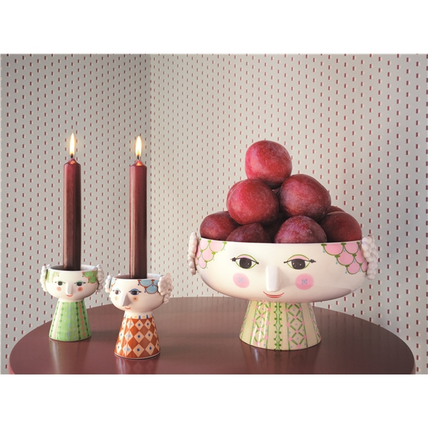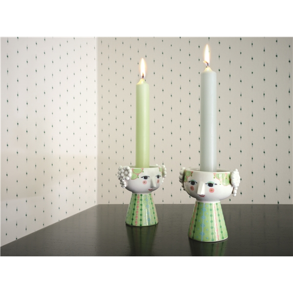 Ljusgrön ljusstake från Bjørn Wiinblads Eva-serie. Eva ljusstaken har ljusgröna nyanser och det karakteristiska Eva-mönstret. Kvinnliga former och färgglada mönster kännetecknar Eva-serien och det vänliga ansiktet har utformats efter Wiinblads egen design.