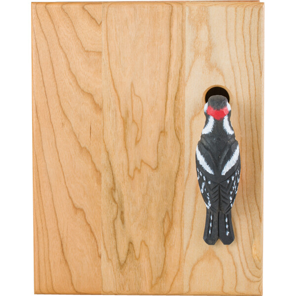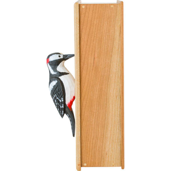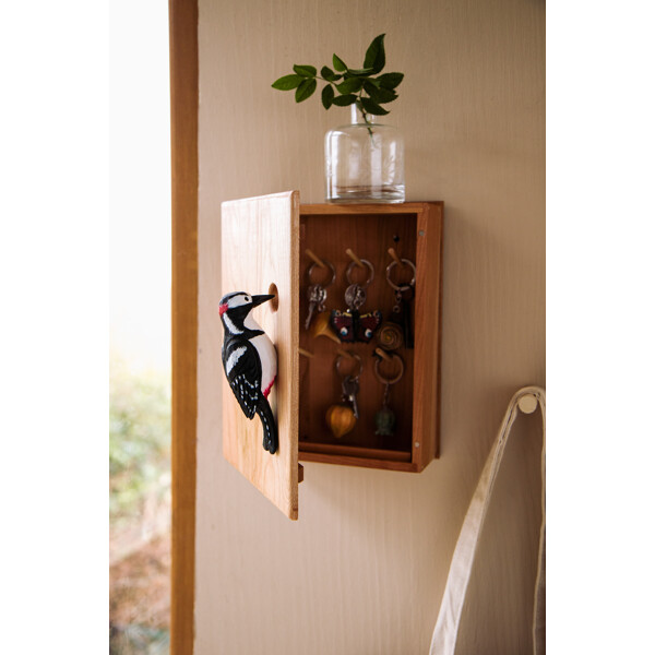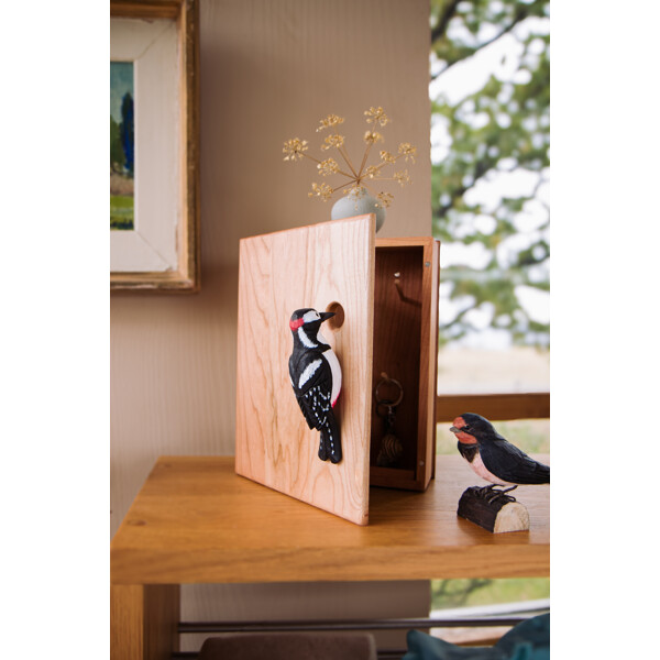 Detta nyckelskåp i trä med naturinspirerad design har stiliga detaljer – en dekoration i karvsnitt och ett litet hål för grepp vid öppning av skåpet. Nyckelskåpet är tillverkat i körsbärsträ och ytbehandlat med traditionell linolja som harmonierar med mässingen i gångjärnen. Tonen i träet mognar med tiden och färgen förändras från ljus till en varm rödaktig nyans. Träet har stor variation i ådringen och även mörka inslag som skapas av hartsfickor. Dekorationen i karvsnitt är målad för hand med vattenbaserad färg.
