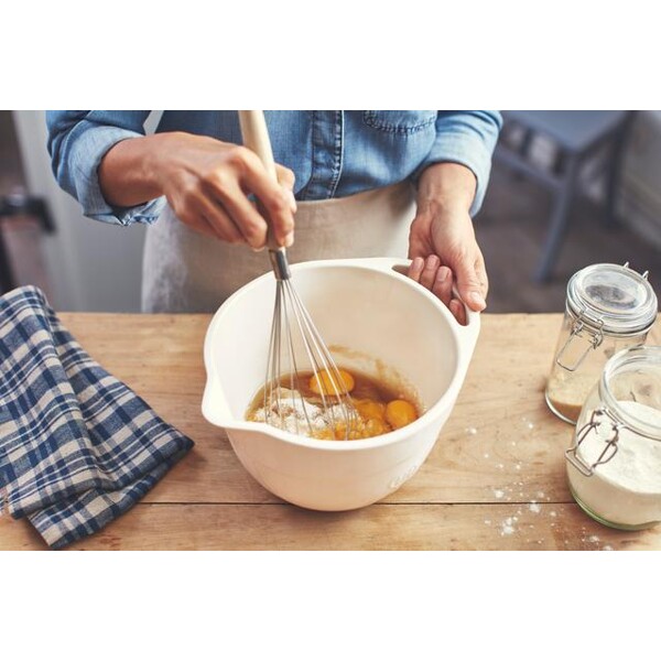 Emile Henry ́s mixskål är lätt- hanterlig, stabila och robust. Den innovativa designen på handtaget ger ett stadigt grepp vid blandning eller för att enkelt lyfta och hälla. Den stora pipen är väldigt praktiskt och fungerar även bra till tjockare deg. Dessutom är keramik ett bra material för att jämnt sprida värme på ett skonsamt sätt vilket gör att du kan använda skålen i vattenbad och vikten av skålen håller den därmed även stadig. Skålen tål mikrovågsugn och diskmaskin.