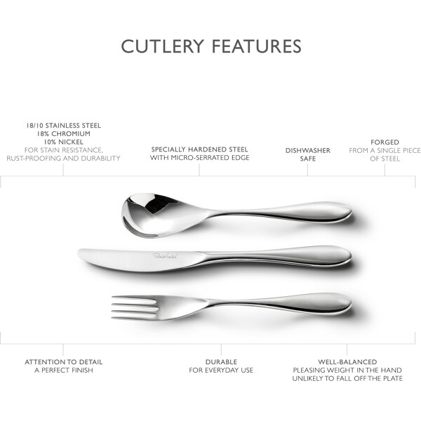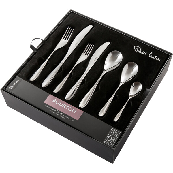 Bourton bestickserie i 42 delar från Robert Welch, inspirerad av slingrande floden som rinner genom den pittoreska byn Bourton on the Water. Med sin mjuka och eleganta profil blir bestickserien snabbt en favorit. Skedar och gafflar är tillverkade av högsta kvalitet 18/10 rostfritt stål. Knivblad är gjorda av speciellt härdat rostfritt stål för att ge bästa möjliga skäregg.