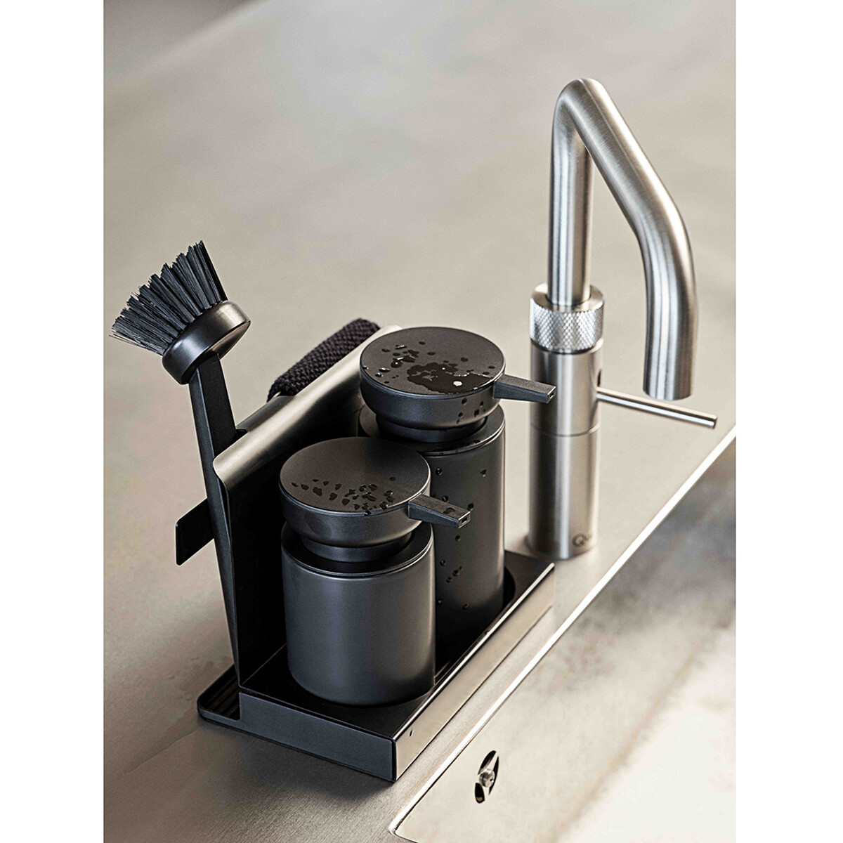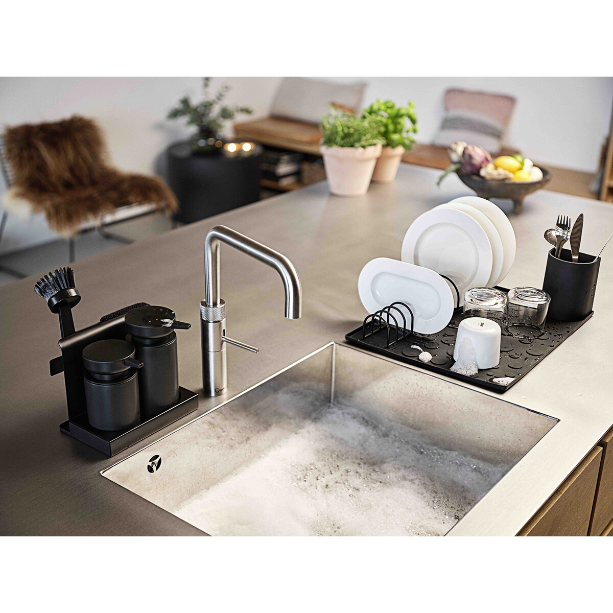 Längst fram står pumpduon för diskmedel och handtvål/handsprit. Båda är tillverkade i keramik. Backstage hänger den stickade disktrasan på tork diskret tills det är dags att använda den. Som sällskap har den en borste i matchande färg. En sista snygg detalj är den lilla brickan som samlar upp överflödigt vatten så att det inte hamnar på köksbordet.