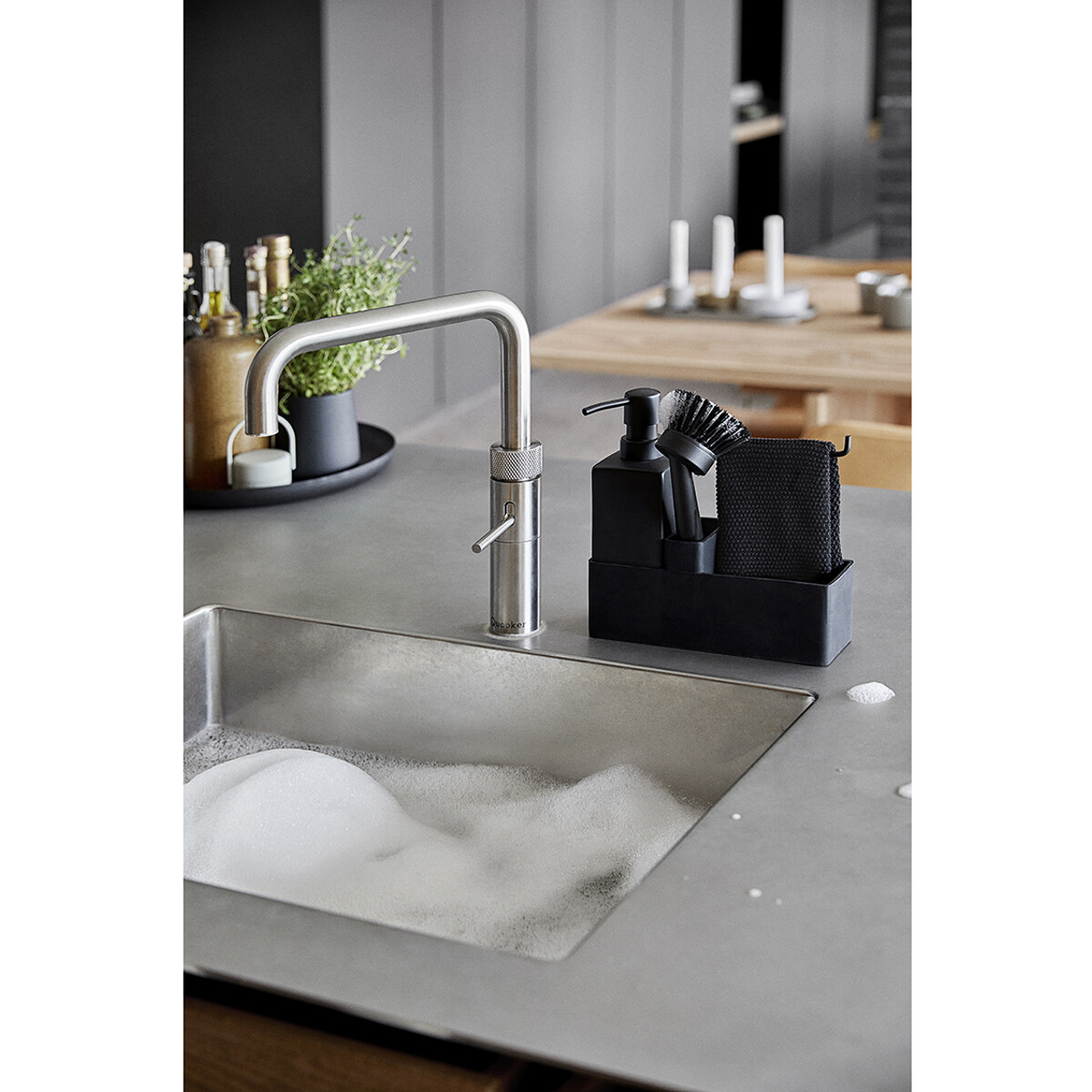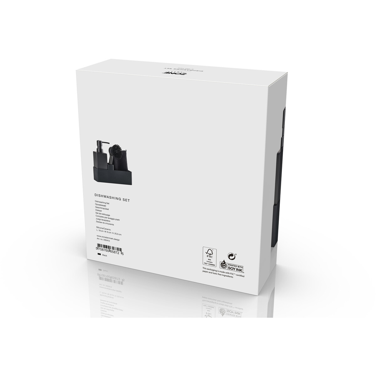Zones populära allt i ett-diskset med disktrasa. Tvålpumpen är gjord av robust keramik, och behållaren är i repfri silikon som är lätt att rengöra. Borsten kan stå själv och borsthuvudet kan bytas ut så att du alltid har en fräsch borste.