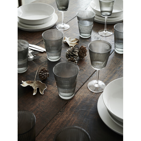 Duka bordet med stil genom att fokusera på det enkla och funktionella i den klassiska silhuetten. Grand Cru Nouveaus 36 cl-glas är munblåst i ett vackert och högkvalitativt mörkgrått rökfärgat glas. Det är ett funktionellt och stapelbart dricksglas som är både klassiskt och modernt – de förhöjer bordsdukningen både till vardags och vid festligare tillfällen. Räfflorna skapar ett livfullt men ändå minimalistiskt uttryck och ett förfinat optiskt färgspel när ljuset bryts i glaset. Förutom att vara dekorativa är räfflorna också funktionella och ger ett bra grepp för både stora och små händer. Med Grand Cru Nouveau får du ett elegant exempel på funktionell glasdesign för ett modernt boende som fungerar bra i kombination med andra Grand Cru-föremål som du kanske har i skåpet. Designen balanserar enkelt estetik med funktion, och det munblåsta rökfärgade glaset framhäver seriens distinkta vardagslyxkänsla och funktionella elegans i stil, struktur och färg.