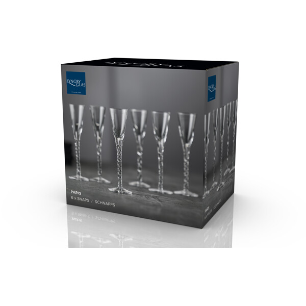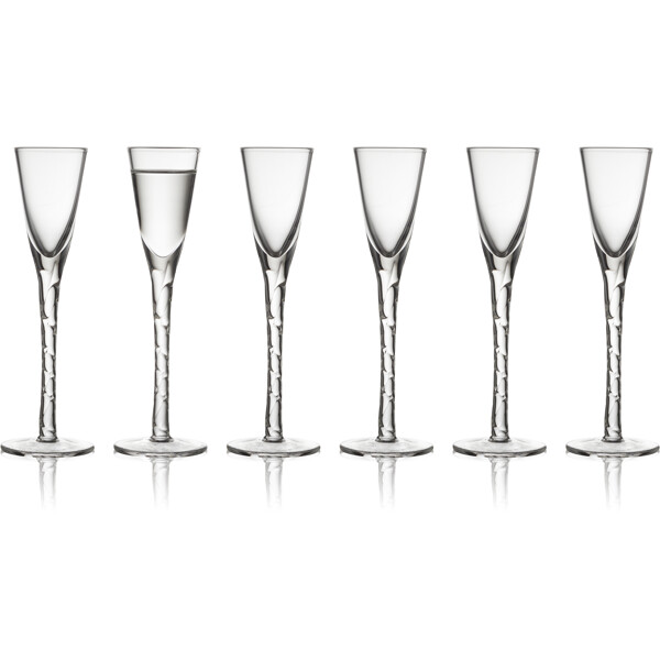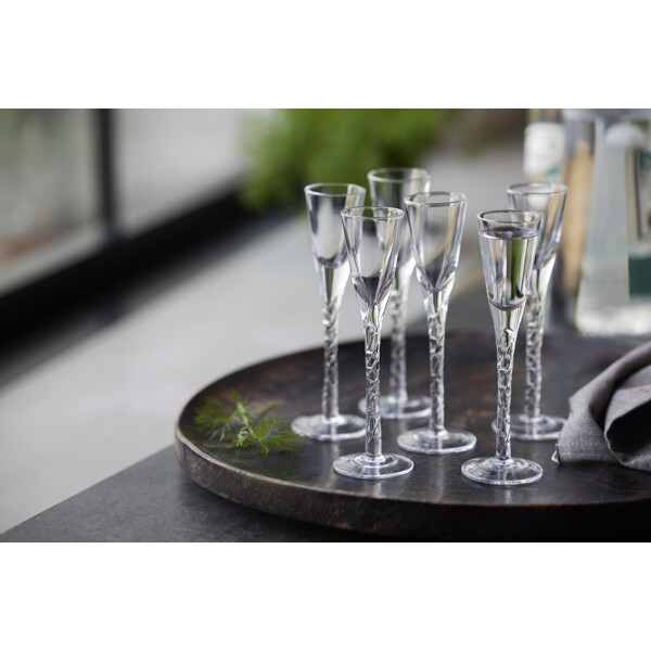6st handgjorda och munblåsta snapsglas med stjälk som har vridits för hand och som bidrar till god stämning runt bordet. Snapsglasen i klarglas har en elegant, klassisk design och rymmer 2,5 cl. H 16 cm.