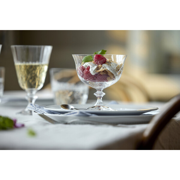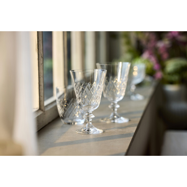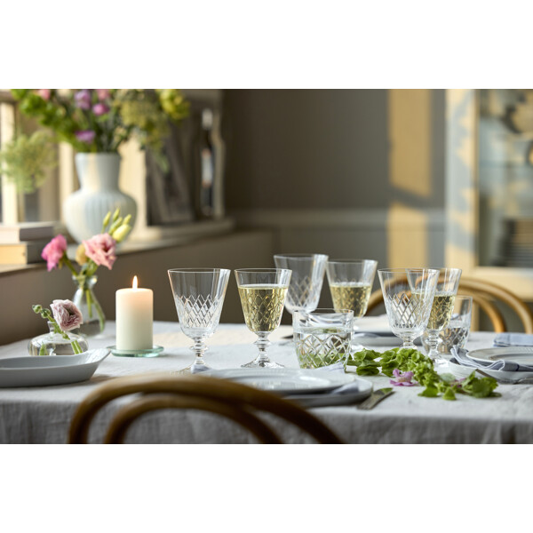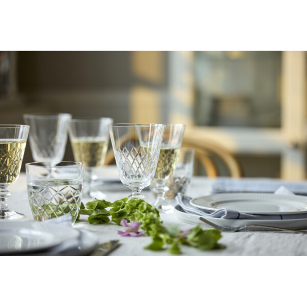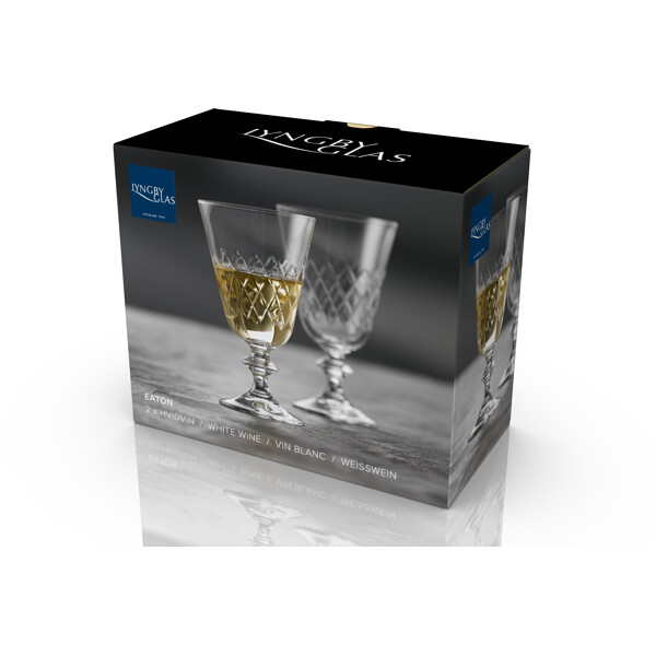 Eaton vitvinsglas, 23 cl, tolkar om det klassiska diamantformade mönstret från det ikoniska Eaton-glaset, som Lyngby Glas skapade på 1960-talet. Designets tidlösa estetik förenar klassisk charm med modern stil och tillför en helt unik stämning vid bordet. Tillverkat i kristallglas erbjuder Eaton enastående klarhet och hållbarhet, vilket gör glaset till ett nöje att använda – oavsett om det är för en mysig vardagsmiddag eller en festlig kväll med vänner. Glasets korta stjälk ger extra stabilitet och gör det bekvämt att hålla i. Eaton tillverkas i Europa med stor precision genom en avancerad produktionsprocess som inkluderar maskinslipning och polering. Resultatet är hög klarhet och en exklusiv finish som framhäver glasets enkla elegans.