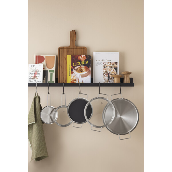 Platt grytlock från Eva Trio. Grytlocket har ett långt handtag placerat på sidan så att man inte bränner sig när man tittar till maten. Under matlagningen kan du hålla andra rätter varma på locket och stapla ovanpå. Samtliga lock passar till alla Eva Trio-grytserier och material.