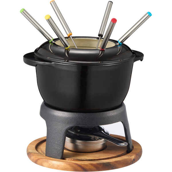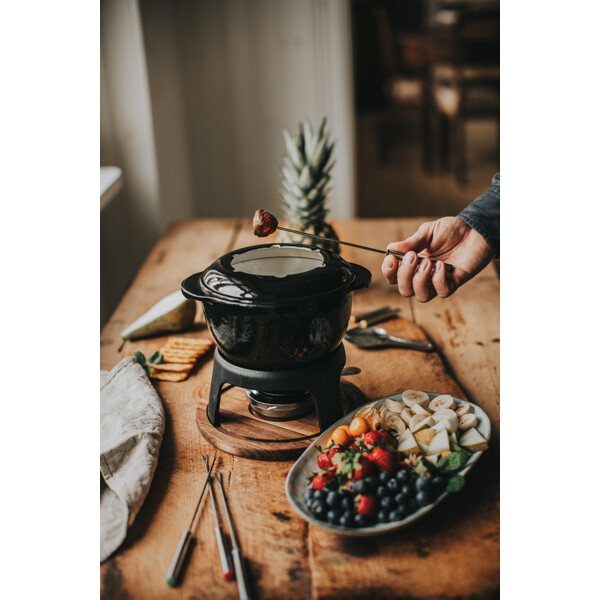 Fonda fondue i rejält gjutjärn med en vacker träplatta i akaciaträ låter dig avnjuta en mysig middag med familj och vänner.