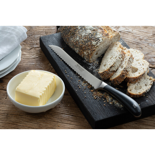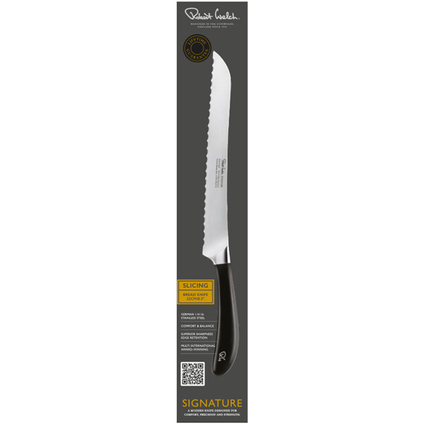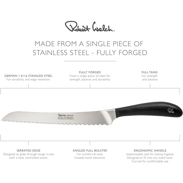 Signature brödkniv 22cm har en tandad klinga med en spetsig ände perfekt för att skiva genom knaprig bröd , franska pinnar och kakor. Tillverkad av tyskt rostfritt stål med ett ergonomiskt DuPont ™ handtag. Alla Robert Welch Signature knivar levereras i snygg presentask, kan diskas i maskin och har 25 års garanti.
