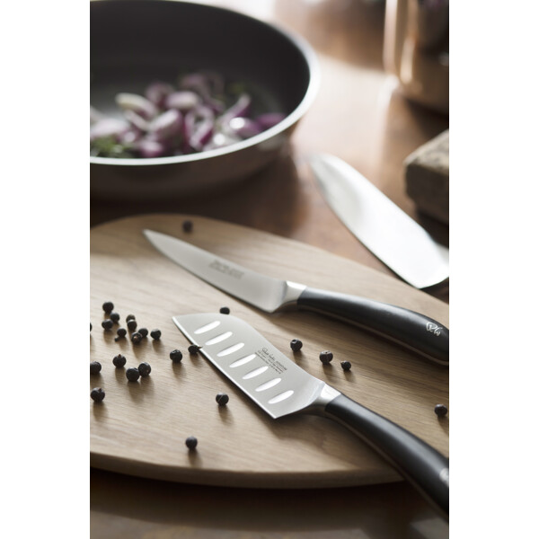 Signature santokukniv 11cm har en japansk stil med brett blad. Santokukniven lämpar sig speciellt för precisionsskivning och tärning av grönsaker. Fördjupningarna på bladet minskar friktionen och gör det enkelt att skiva.