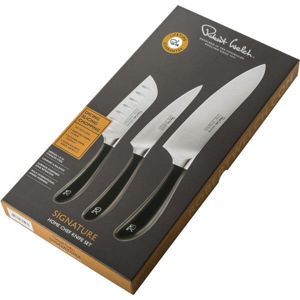 Robert Welch Signature Hemmakocken 3del knivset som innehåller en 11 cm Santokukniv, en 12 cm Allkniv och en 18 cm Kockkniv.