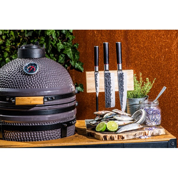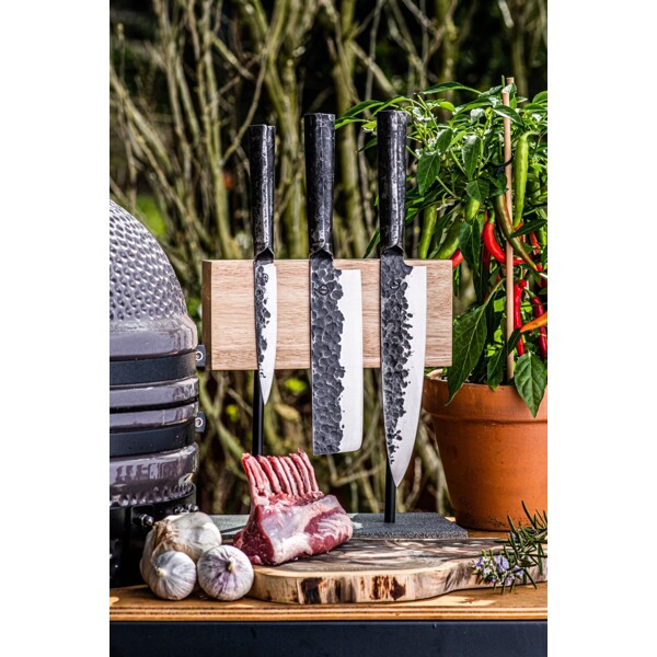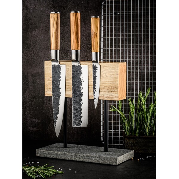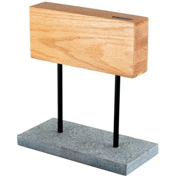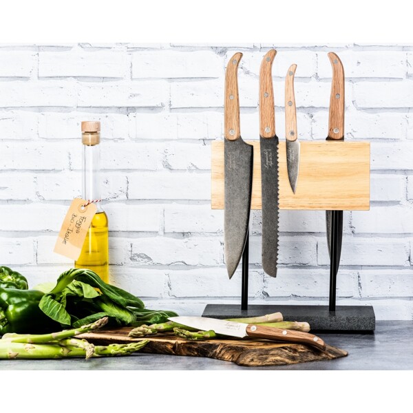 Ett stilrent knivblock som visar upp dina knivar som har ett vackert utformat blad. Detta block är användbart på båda sidor och är tillverkat av ek med en bas i natursten. 2st olika ben medföljer, silver eller svarta.