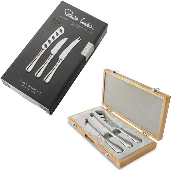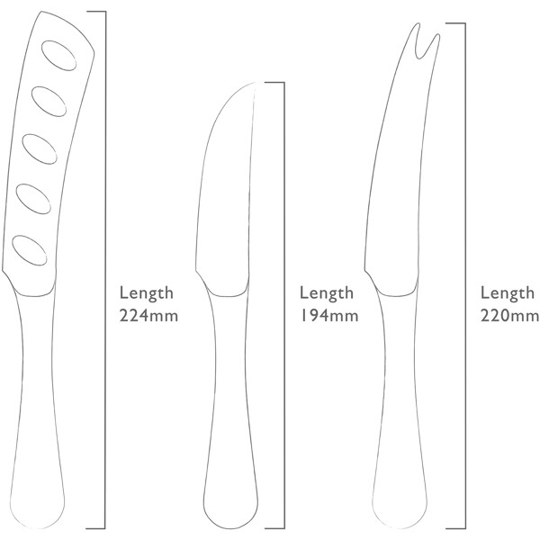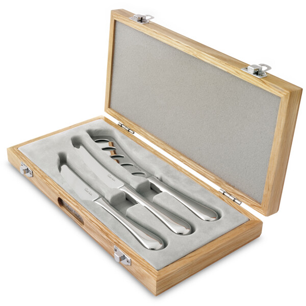 En uppsättning av 3st ostknivar med blank yta från Radford bestickserie. Levereras i en snygg ekask med grå sammet.
