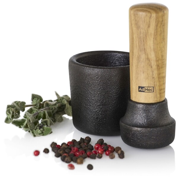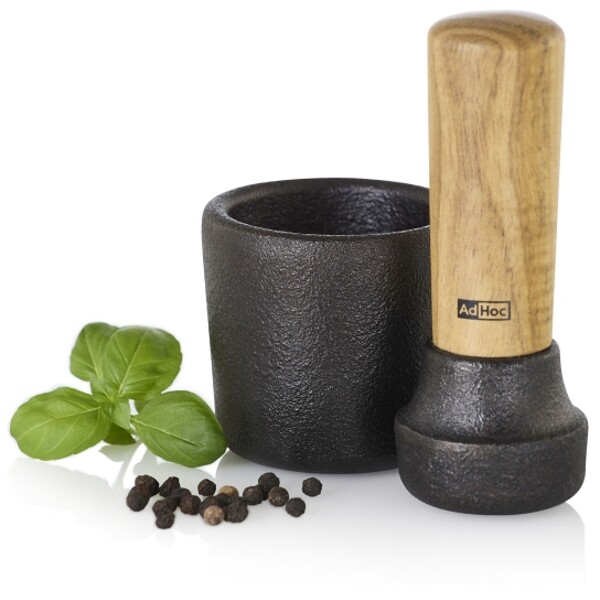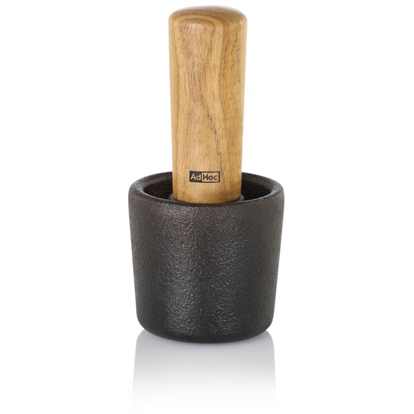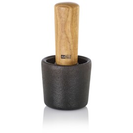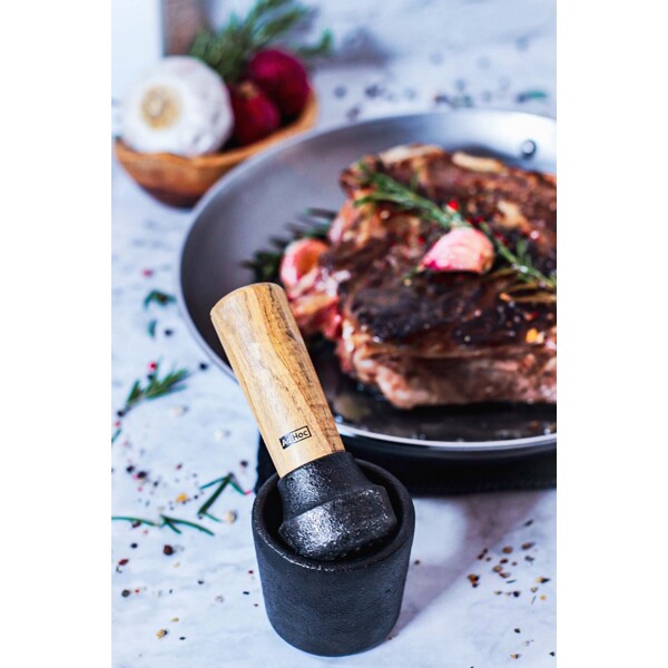 Högkvalitativ mortel av gjutjärn och akaciaträ. Perfekt för salt, peppar och andra granulerade kryddor. Handmalning ger en intensiv arom. Genomtänkt design och praktisk storlek för matlagning vid bordet.