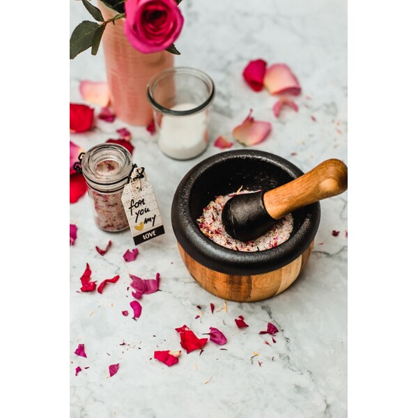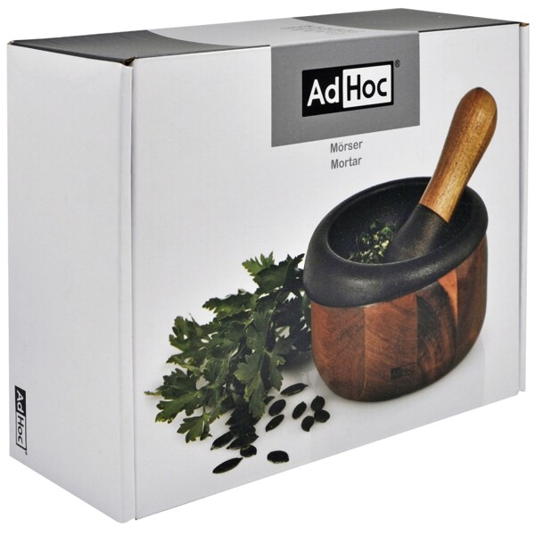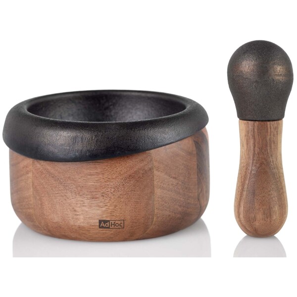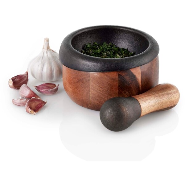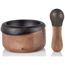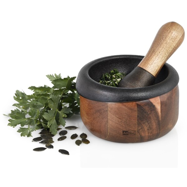 Högkvalitativ mortel för traditionell beredning. Krossa, mal och bulta enkelt. Slipytor är av högkvalitativt gjutjärn och handtag av akaciaträ.
