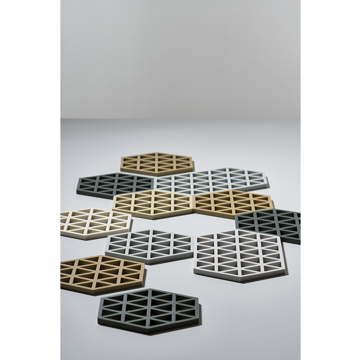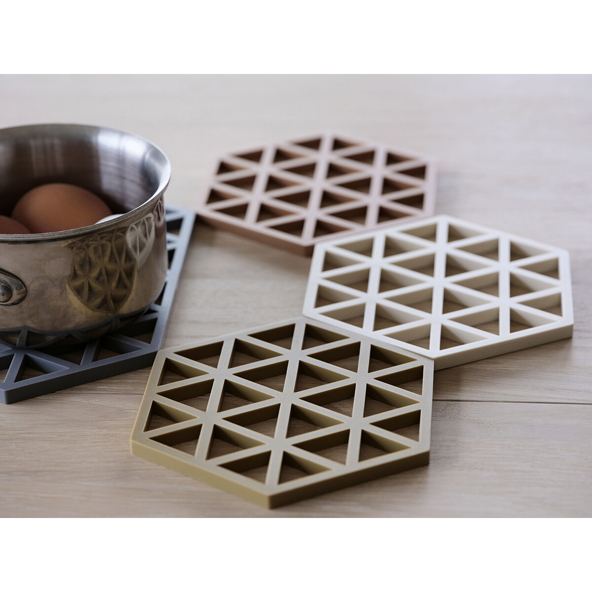 Serien är skapad av designertrion VE2. Triangles finns i många spännande färger och är perfekt att blanda med Hexagon grytunderläggen, som har samma utvändiga mått.