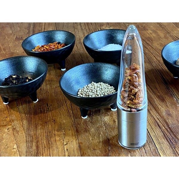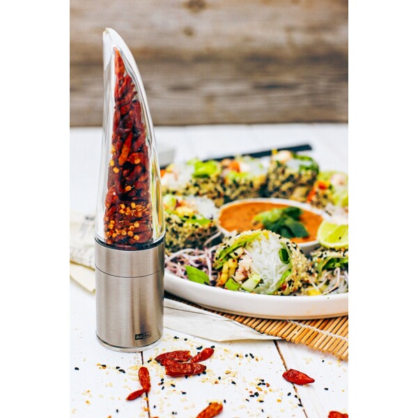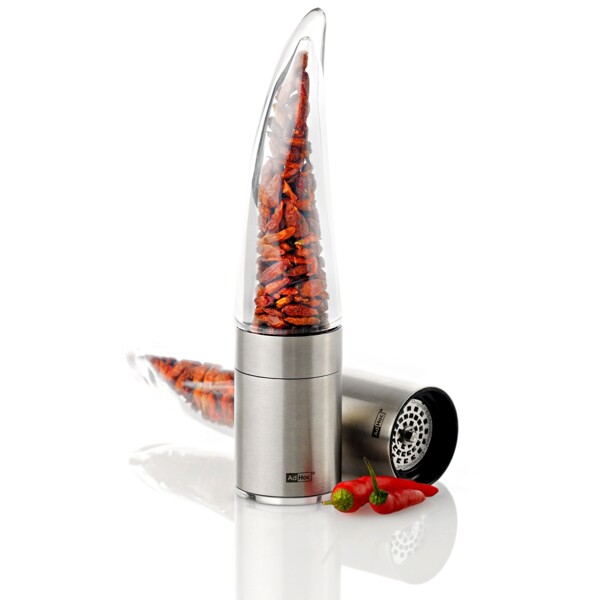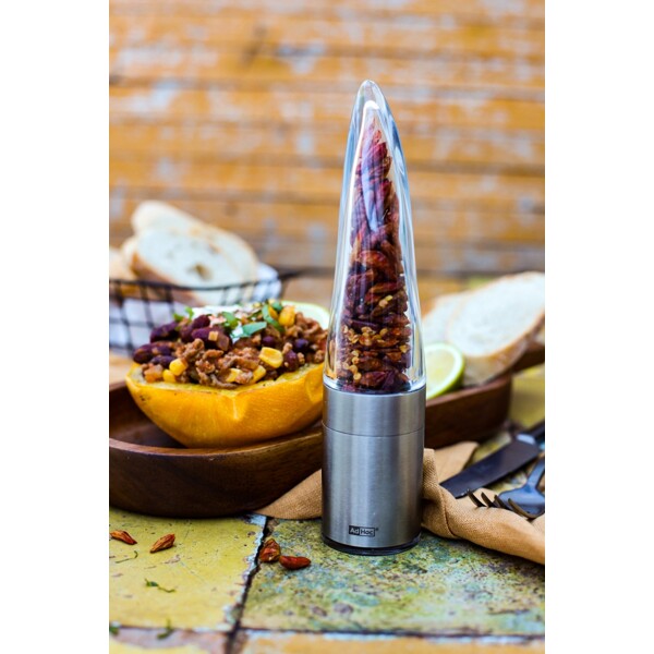 Innovativ chiliskärare i rostfritt stål och akryl med original AdHoc PreciseCut®. Har fått "German Design Award 2018" Stor malningsbehållare och praktiskt aromskyddslock.