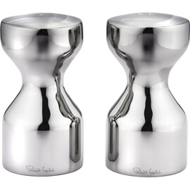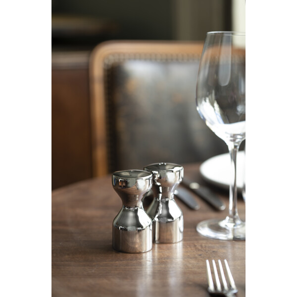 Denna moderna tolkning är tillverkad i spegelpolerat 18/10 rostfritt stål och förmedlar samma tidlösa elegans som originalet. Den skulpturala formen gör shakers till lika mycket konstnärliga objekt som funktionella serveringsdetaljer.