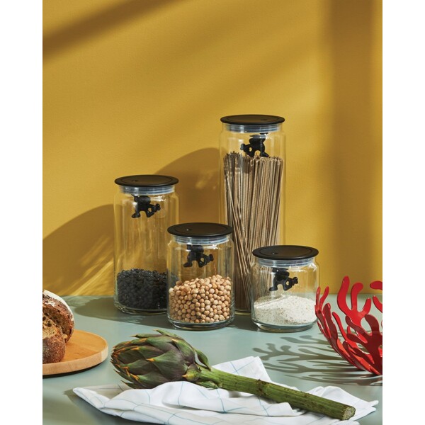 Den ultimata burken för smart och snygg förvaring. Burkarna finns i flera olika storlekar och färger. Glasburken har ett tättslutande lock av plast. Själva designen sitter på undersidan av locket i form av en charmig liten gubbe som försöker klamra sig fast. Det är upp till var och en att mixa och matcha mellan de olika storlekarna och färgerna. Burken finns i fyra olika storlekar som alla har samma diameter (10,5 cm) men som har olika höjd. Burken som har höjd 20,5 cm rymmer 500 g kaffe.