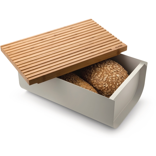 Brödlådan Mattina från italienska Alessi med både förvaring och skärbräda. Designduon Big-Game står för den enkla och stilrena designen. Den praktiska skärbrädan som är lock till brödbehållaren är utformad för att skära bröd så att smulorna samlas och inte sprids.