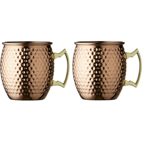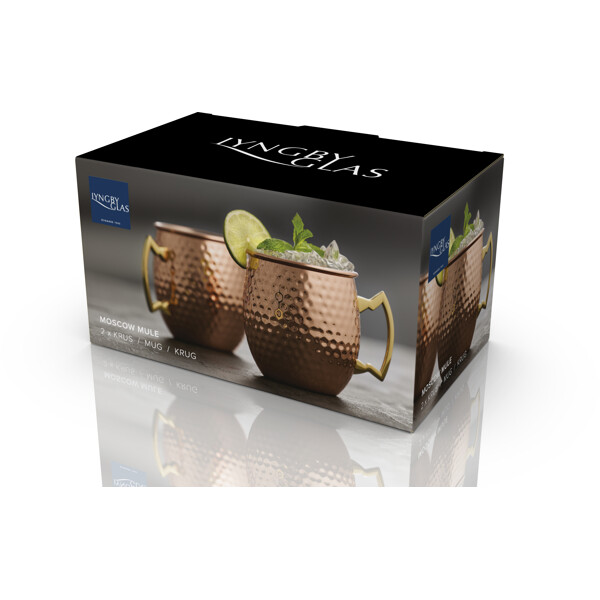 Den vackra muggen med handtag och kopparbelagd, hamrade exteriör är den klassiska och karakteristiska muggen för den populära cocktailen moscow mule, som har fått en modern comeback. Moscow mule görs enkelt av ginger beer, vodka, limesaft och rikligt med isbitar så att drycken håller sig iskall. Muggen är mycket lätt och rymmer 55 cl.