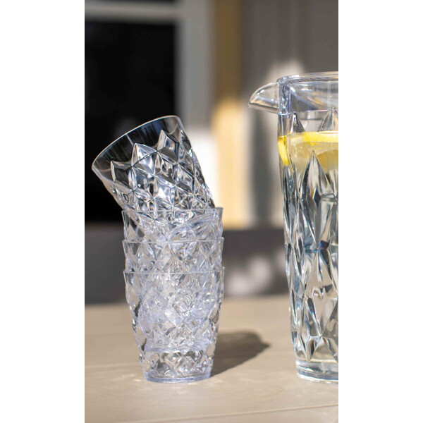 Snyggt set med CRYSTAL vattenkaraff 1,6 liter och fyra stycken matchande glas. Karaffen och glasen tillhör den okrossbara plastglasserien Superglas från Koziol, tillverkade i 100% återvinningsbar och giftfri thermoplast. Ekovänlig design och tillverkad i Tyskland.