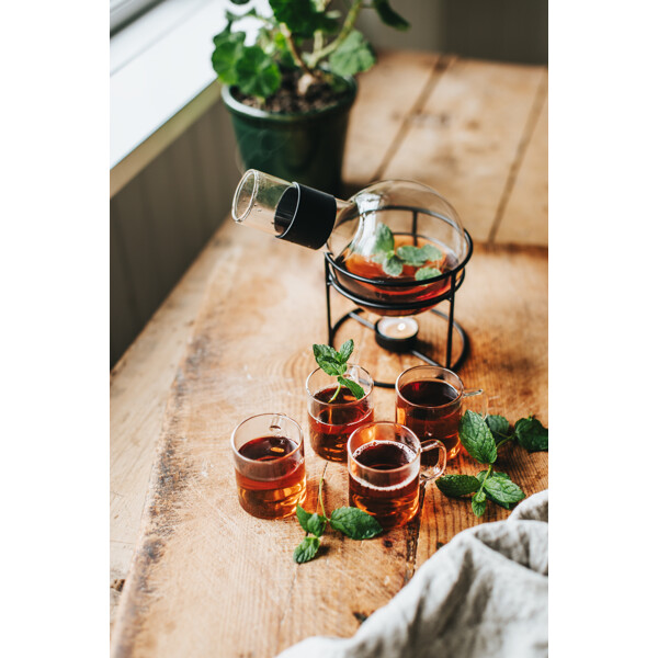 Elegant rund glöggkanna i glas med svart metallställ och plats för värmeljus. Håller glöggen varm och redo att serveras under hela kvällen. Perfekt för advent, julbord och vintermys. Rymmer ca 1,3 liter.