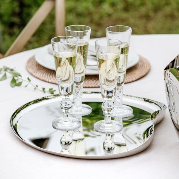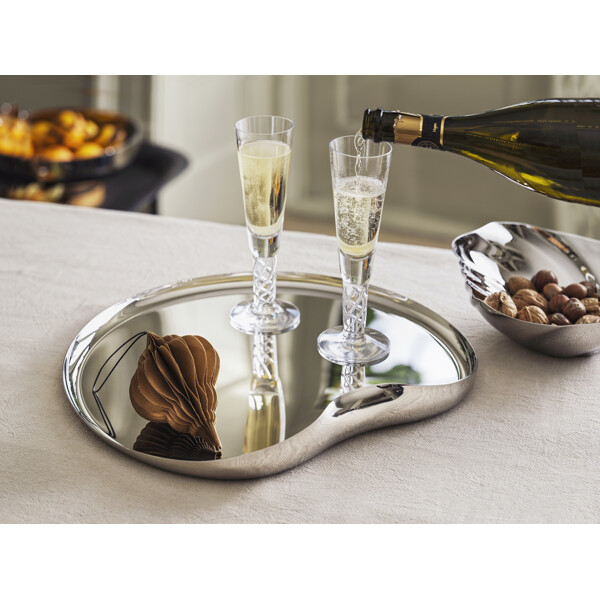 Robert Welch Drift serveringsbricka är en del av den prisbelönta Drift-serien, som mottog *Excellence in Housewares – Top of the Table Award 2018*. Brickan är designad för att framkalla en känsla av rörelse, med organiska former och spegelpolerade ytor som reflekterar omgivningen och skapar liv i varje dukning.